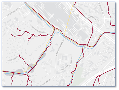 Below is an example of mapping waterways (rivers) of an area at three different scales. The red is at a 1,200 scale, the blue is at a 100,000 scale, and the yellow is at a 24,000 scale. As you can see, the three datasets vary greatly in three spatial accuracy and location of the actual waterways. But this is all relative to the size of the map we want to produce.